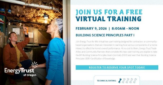 Join Energy Trust for this virtual two-part training designed for contractors or community-based organizations that are interested in learning how various components of a home interact to affect the home’s overall performance. At no cost to them, Energy Trust Trade Allies and Community Partners that complete this two-part training are eligible to take the BPI Building Science Principles Exam (normally $109) and earn their Building Science Principles (BSP) Certification of Knowledge.
