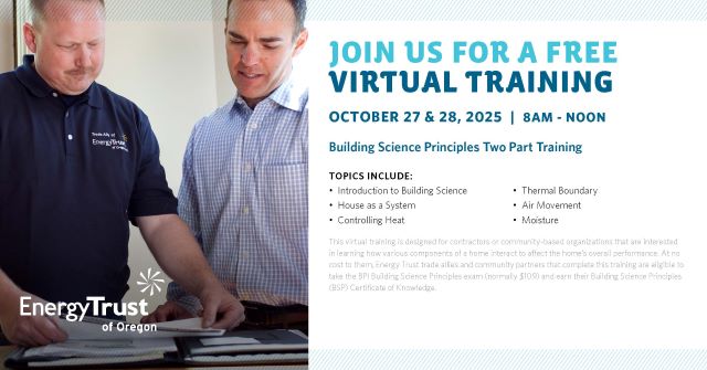 Join Energy Trust for this virtual training, designed for contractors or community-based organizations that are interested in learning how various components of a home interact to affect the home's overall performance. At no cost to them, Energy Trust trade allies and community partners that complete this training are eligible to take the BPI Building Science Principles Exam (normally $109) and earn their Building Science Principles (BSP) Certificate of Knowledge.