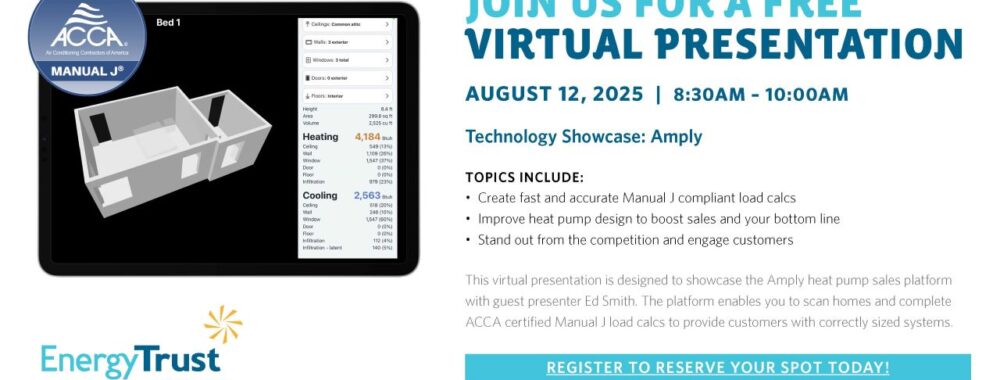 This virtual presentation is designed to showcase the Amply heat pump sales platform with guest presenter Ed Smith. The platform enables you to scan homes and complete ACCA certified Manual J load calcs to provide customers with correctly sized systems.