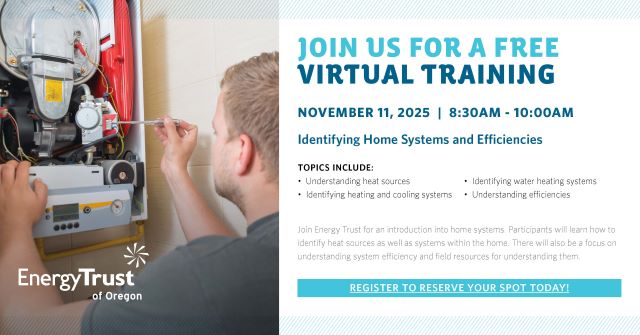Join Energy Trust for an introduction into home systems. Participants will learn how to identify heat sources as well as systems within the home. there will also be a focus on understanding system efficiency and field resources for understanding them.